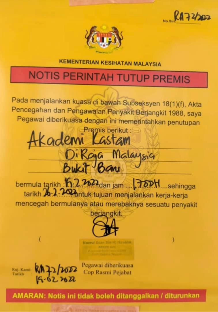MELAKA: Selepas pendedahan Utusan Malaysia, Akademi Kastam Diraja Malaysia (Akmal) di Bukit Baru dekat sini diarahkan tutup oleh Kementerian Kesihatan bermula semalam sehingga 26 Februari ini.