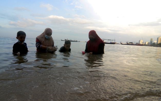 Suasana petang ketika air laut surut menjadi pilihan untuk mereka berkumpul mencari siput remis di kawasan pesisir pantai persiaran Gurney seterusnya dijadikan hidangan sampingan buat keluarga.