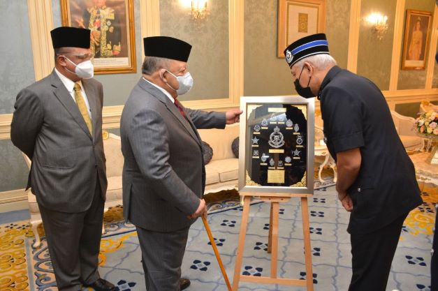 ARAU : Raja Perlis, Tuanku Syed Sirajuddin Putra Jamalullail berkenaan berangkat menerima kunjungan sembah menghadap Ketua Polis Negara, Tan Sri Acryl Sani Abdullah Sani dan timbalannya, Datuk Razarudin Husain di Balai Menghadap Biru, Istana Arau di sini semalam.