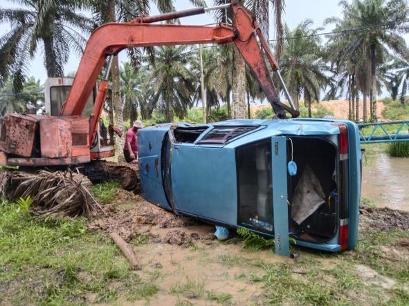 Mangsa masih berada dalam kenderaan semasa kereta Proton Iswara yang dipandunya berjaya dikeluarkan dari sungai pada pukul 4.40 petang.UTUSAN