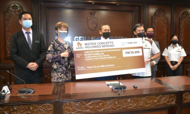 “Saya ucapkan terima kasih kepada pihak Matrix Concepts yang menyumbangkan sebanyak RM30,000 kepada Akaun Amanah OKU Negeri Sembilan. Saya juga mengalu-alukan mana-mana pihak korporat yang berminat untuk turut memberikan sumbangan,” katanya kepada pemberita di sini hari ini.