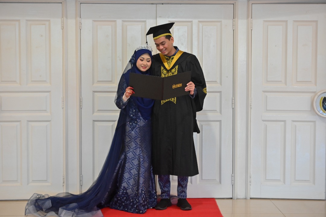 KUALA NERUS: Selepas empat jam diijabkabulkan, pasangan pengantin baharu terpaksa bergegas meninggalkan majlis perkahwinan mereka bagi menghadiri konvokesyen di Universiti Sultan Zainal Abidin (Unisza) di sini.