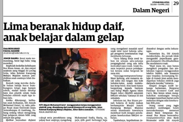 Semalam, Utusan Malaysia melaporkan Nur Rizan buntu untuk memastikan anak-anak mendapat meneruskan pembelajaran dalam suasana yang lebih baik.