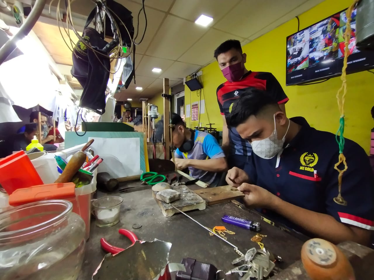 Antara yang sibuk sehingga ‘bermandi peluh’, 50 tukang emas yang diupah MZ Gold, di sini yang kini bertungkus-lumus menyiapkan lebih 2,000 tempahan rantai, loket, gelang dan cincin selewat-lewatnya sehari sebelum 1 Syawal.