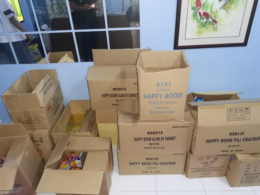 “Pemeriksaan lanjut di bahagian ruang tamu rumah tersebut menemukan 13 buah kotak berwarna coklat didalamnya berisi pelbagai jenis mercun. Anggota bertugas kemudiannya meminta suspek menyerahkan sebarang dokumen yang sah berkenaan pemilikan barang berkenaan.
