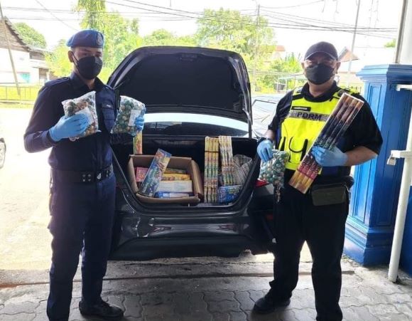 “Setelah ditahan untuk pemeriksaan, pihak polis telah menemui sejumlah mercun dan bunga api yang tidak mempunyai dokumen yang sah disembunyikan di bonet kereta tersebut.
