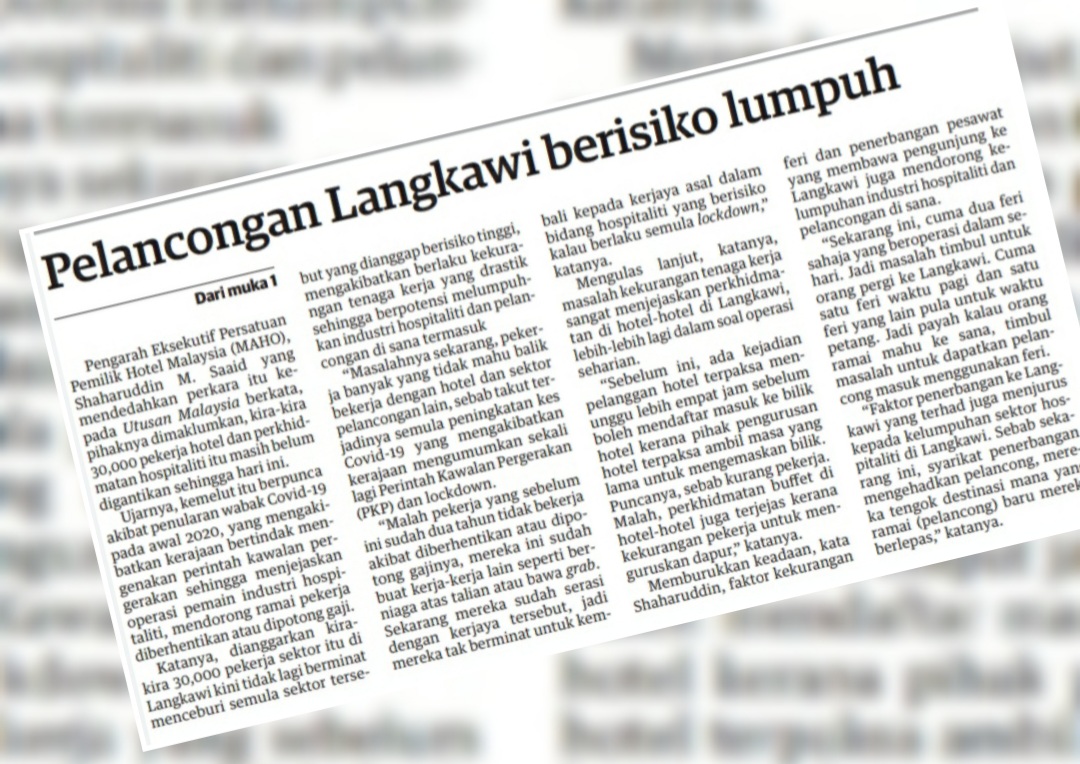 Sebelum ini, akhbar ini melaporkan, industri pelancongan berisiko lumpuh kerana kekurangan tenaga kerja kritikal khususnya dalam bidang hospitaliti seperti perhotelan dan peruncitan hingga tidak mampu menampung permintaan tinggi pelancong.