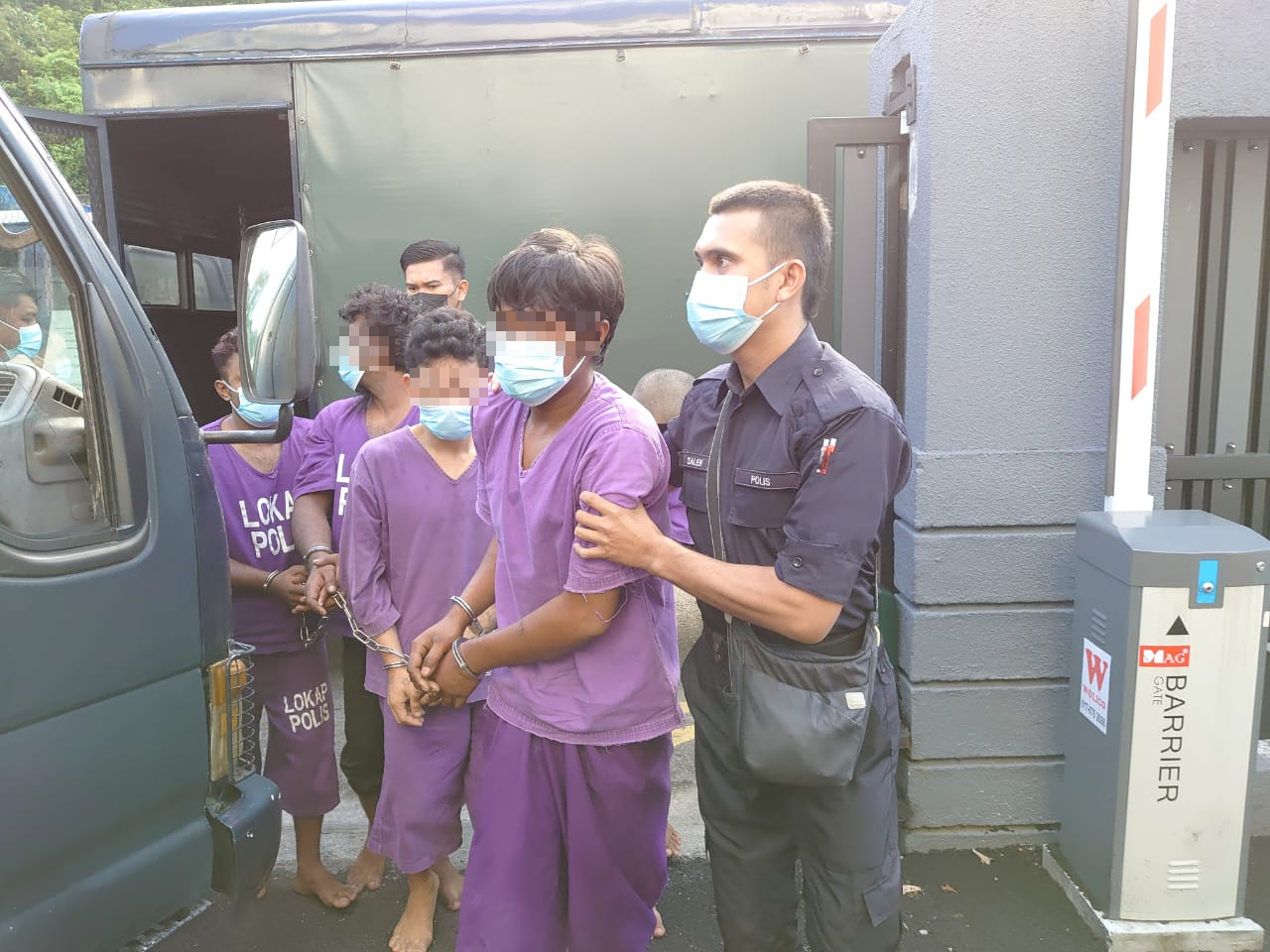Terdahulu, suspek yang memakai pakaian lokap berwarna ungu sambil dikawal polis tiba di pekarangan Kompleks Mahkamah Johor Bahru pada pukul 9.13 pagi.
