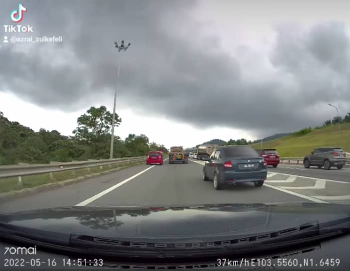 Terdahulu tular dalam media sosial satu rakaman video berdurasi 34 saat memaparkan sebuah kereta Myvi berwarna merah cuba memotong sebuah lori treler di laluan kecemasan dan hampir berlaku kemalangan antara dua kenderaan terbabit.