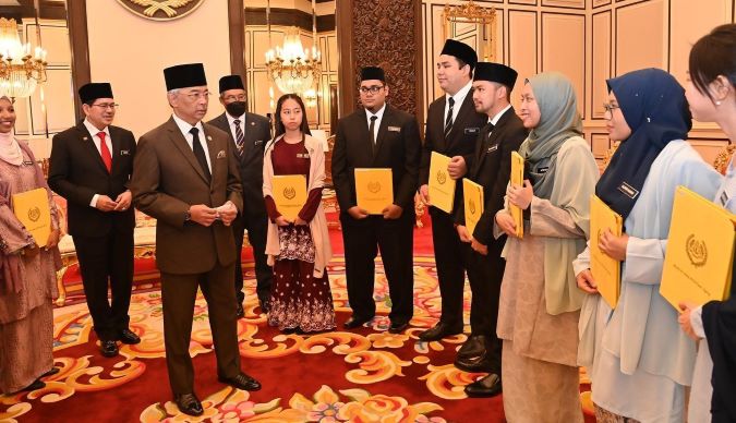 PETALING JAYA: Yang di-Pertuan Agong, Al-Sultan Abdullah Ri’ayatuddin Al-Mustafa Billah Shah berkenan mengurniakan Biasiswa Yang di-Pertuan Agong (BYDPA) kepada 12 penuntut Institut Pengajian Tinggi (IPT) di Istana Negara, hari ini.