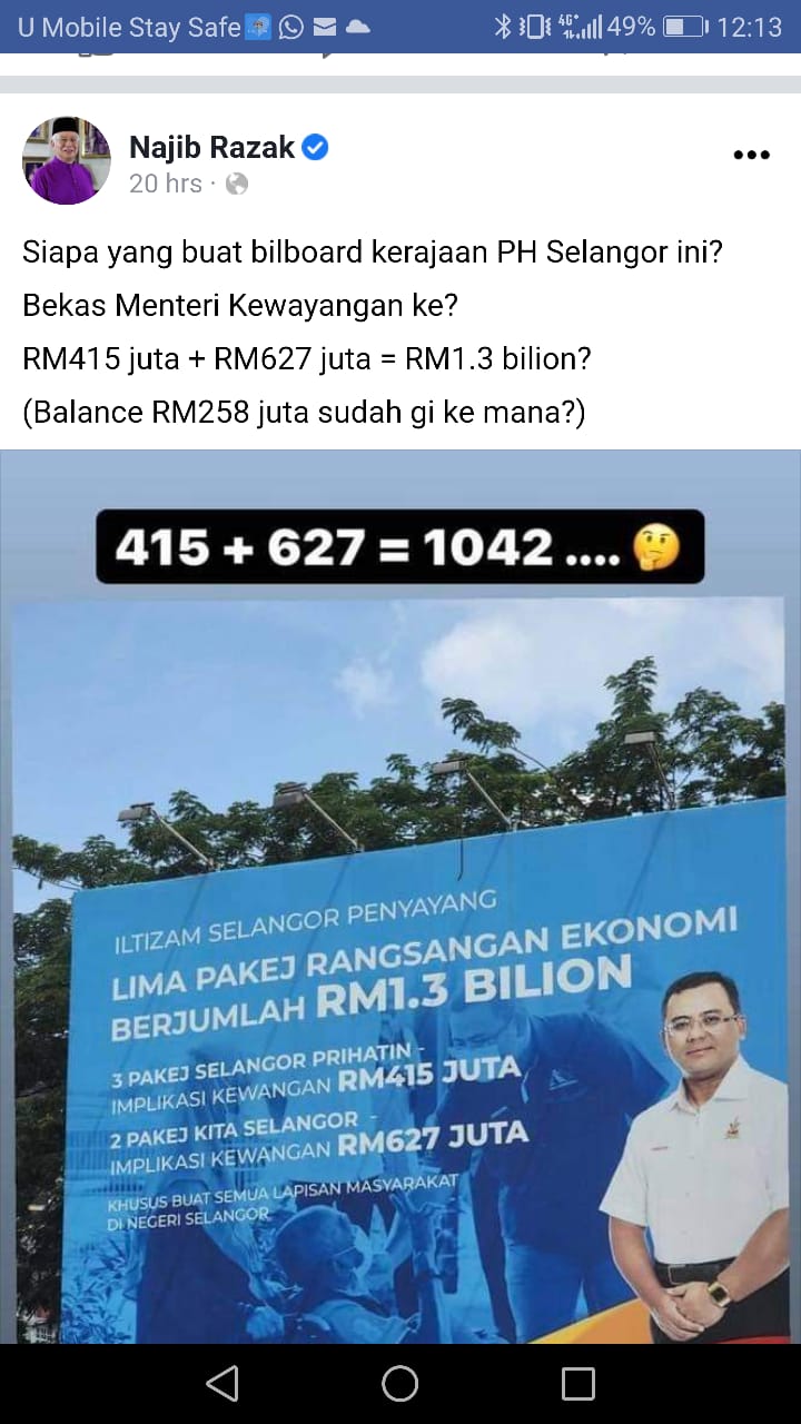 SHAH ALAM- Bekas Perdana Menteri, Datuk Seri Najib Razak disifatkan lewat dua hari kerana papan iklan yang dikatakan mempamerkan kiraan bajet yang salah telah diturunkan oleh kerajaan negeri.