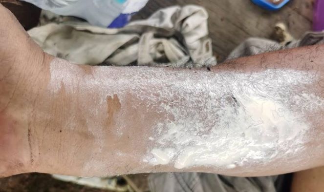KOTA BHARU : Seorang warga emas melecur pada bahagian pergelangan tangan kanan semasa berusaha menyelamatkan barangan selepas rumahnya terbakar di Kampung Bunut Payong di sini hari ini.