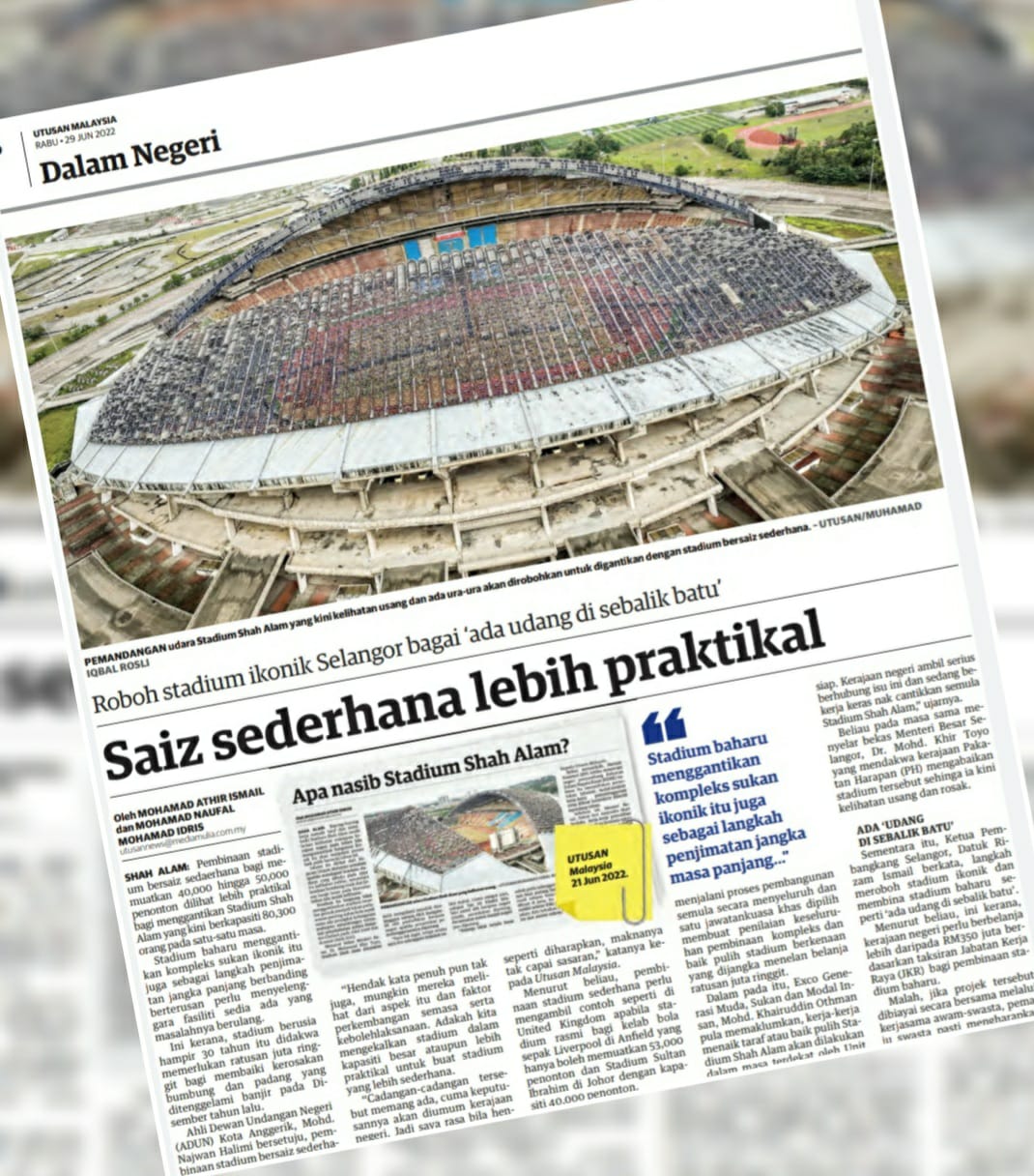 SHAH ALAM: Dakwan Stadium Shah Alam mahu diroboh dan digantikan dengan stadium berkapasiti sederhana membawa kepada persoalan keraguan terhadap keupayaan pentadbiran dan pengurusan kewangan serta aset-aset di bawah kerajaan negeri. Ini kerana terdapat aset dan projek kerajaan negeri didakwa gagal diuruskan dengan baik seperti Hotel Carlton dekat sebelah Pusat Akuatik di Seksyen 13 dan Yayasan Selangor yang mempunyai pelbagai aset termasuk di Bukit Bintang, Kuala Lumpur. Malah, bangunan Plaza Perangsang…