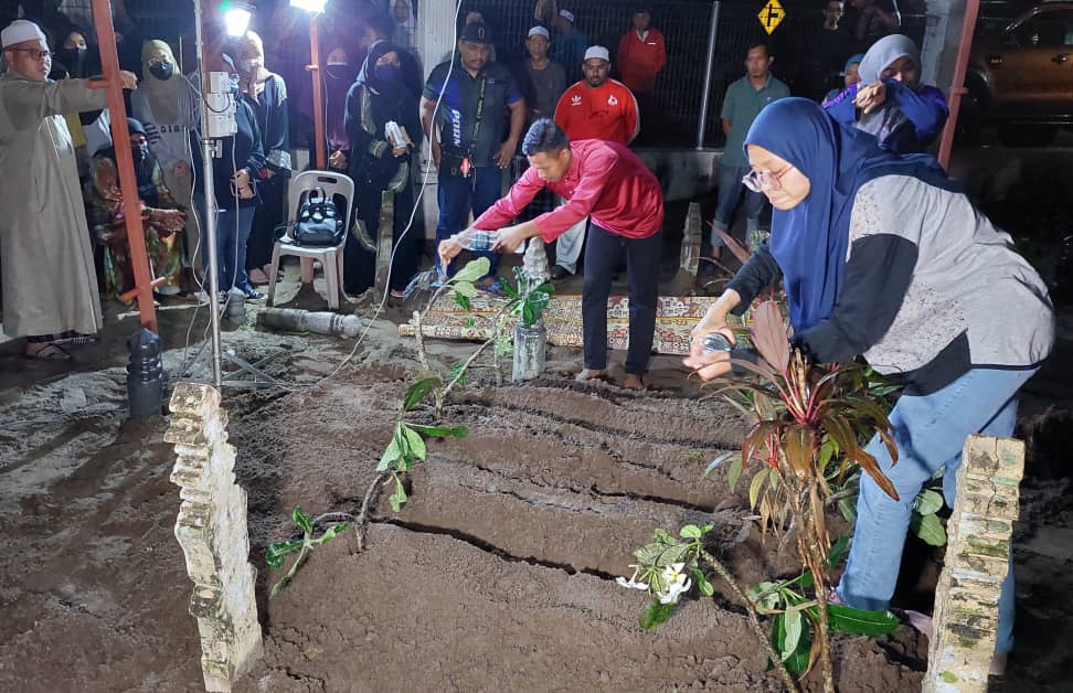 Suasana hiba turut dirasai di kawasan tanah perkuburan yang terletak bersebelahan masjid tersebut dan dihadiri ramai saudara, kenalan serta penduduk setempat.