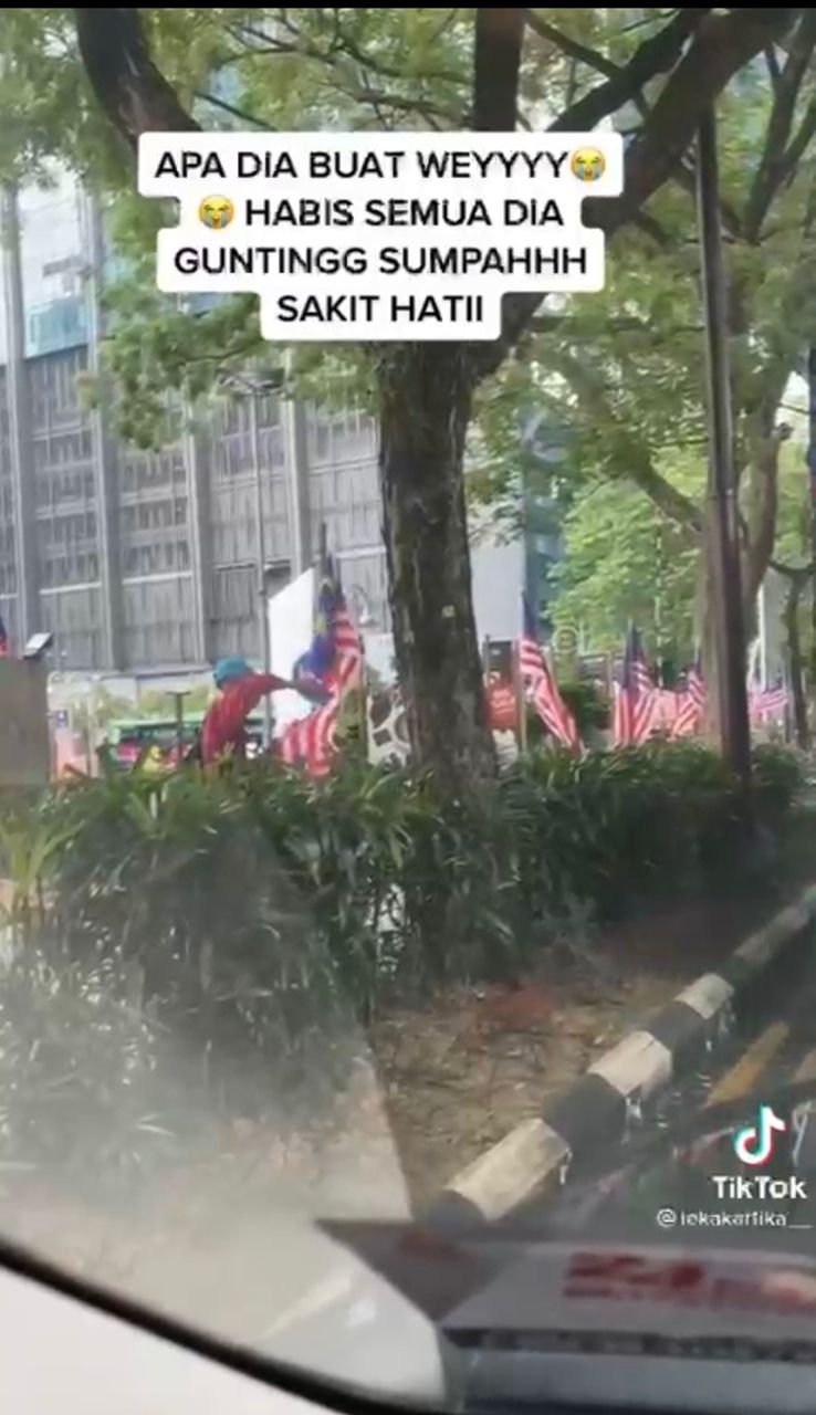 Semalam tular rakaman video berdurasi 38 saat yang dimuat naik di TikTok menunjukkan lelaki berbaju merah dan memakai topi itu memegang gunting dan merosakkan beberapa kain bendera.