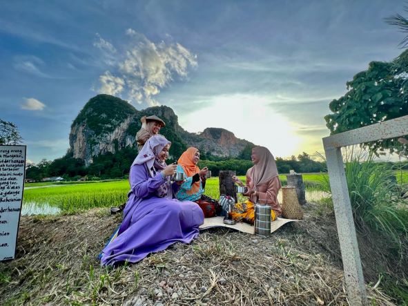 PENGUNJUNG menikmati keindahan alam yang berlatarbelakangkan bukit dan sawah padi menghijau di Balbuk Haus , Kampung Balik Bukit, Chuping, Padang Besar, Perlis.- UTUSAN/MOHD. HAFIZ ABD. MUTALIB
