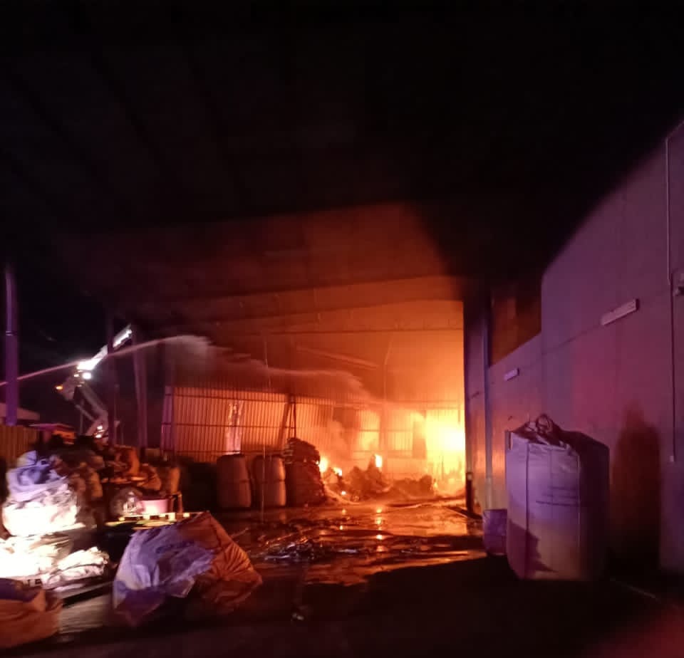 BUKIT MERTAJAM: Sebuah kilang memproses bahan kitar semula termasuk plastik hampir musnah dalam kebakaran dalam kejadian di Jalan Permatang Tinggi, di sini malam tadi.