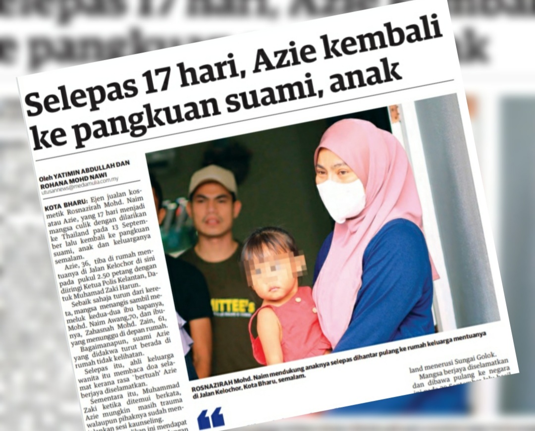 Utusan Malaysia 4 Oktober lalu melaporkan, Azie, yang 17 hari menjadi mangsa culik dengan dilarikan ke Thailand pada 13 September lalu kembali ke pangkuan suami, anak dan keluarganya.