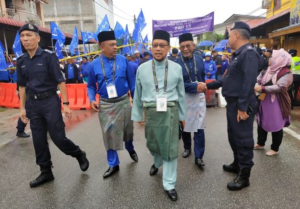 TUMPAT: Bacaan selawat dan laungan takbir mengiringi calon Barisan Nasional (BN) Datuk Che Abdullah Mat Nawi di pekarangan Pejabat Tanah dan Jajahan (PTJ) di sini untuk proses penamaan calon bagi Pilihan Raya Umum Ke-15 (PRU-15) hari ini.