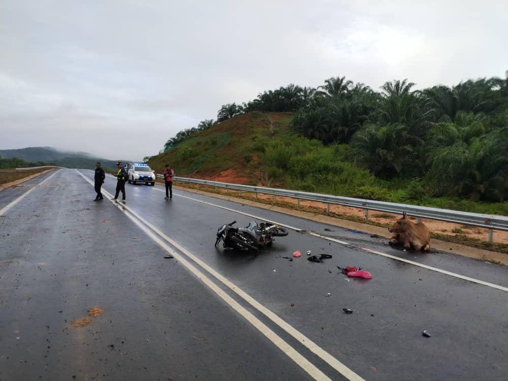 Katanya, semasa tiba di lokasi kejadian, mangsa dipercayai tidak sempat mengelak sebelum melanggar seekor lembu yang tidur di atas jalan.