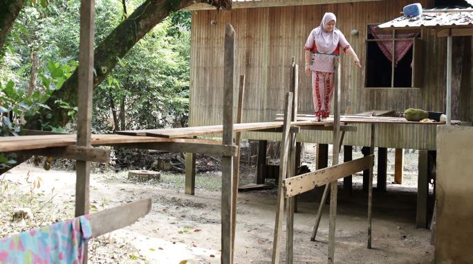 Wan Rohaya memberitahu, titi kayu itu dibina sendiri oleh suaminya, Tuan Syed Mohd. Saufi Tuan Soh, 34, menggunakan kayu-kayu terpakai. Kata Wan Rohaya , suaminya mengambil masa selama sehari untuk menyiapkan titi tersebut untuk kemudahan mereka semasa waktu banjir.-UTUSAN