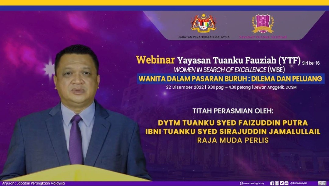 Webinar bertemakan “Women In Search of Excellence” anjuran Yayasan Tuanku Fauziah (YTF) dengan kerjasama Jabatan Perangkaan Malaysia pada kali ini membawa tajuk ‘Wanita Dalam Pasaran Buruh: Dilema dan Peluang” di mana beberapa ahli panel undangan telah dijemput untuk mengupas topik melalui dua sesi forum dan juga sesi ucaptama yang disampaikan oleh Ketua Perangkawan Malaysia, Dato’ Sri Dr. Mohd Uzir Mahidin.