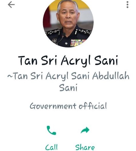 “PDRM baru-baru ini mengesan satu kumpulan di aplikasi WhatsApp yang mempromosikan satu pelaburan dan terdapat satu profil menyamar sebagai Acryl Sani