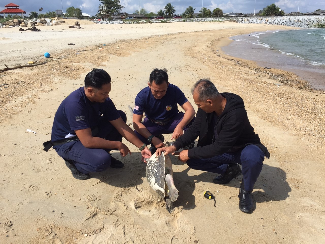 Bangkai tuntung berkenaan kemudian turut ditanam di kawasan pesisir pantai oleh kakitangan Jabatan Perikanan Negeri. – UTUSAN