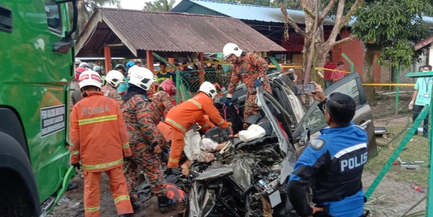 BUKIT GANTANG: Empat warga emas maut setelah kereta dinaiki mereka terlibat kemalangan dengan sebuah treler di Jalan Sungai Baru, Trong dekat sini petang tadi.