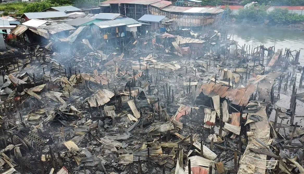 SANDAKAN: Kira-kira 400 orang tinggal sehelai sepinggang apabila 90 rumah musnah dalam kebakaran di perkampungan atas air di Kampung Cenderamata, Jalan Batu Sapi hari ini.