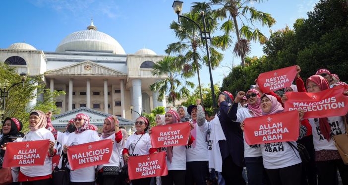 Mereka memakai baju-T dengan slogan ‘Kami Bersama Abah’ dan menggunakan tanda pagar #AbahTabah di selempang berwarna merah.
