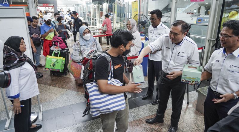 PETALING JAYA: Keretapi Tanah Melayu Berhad (KTMB) bersama Menteri Pengangkutan, Anthony Loke Siew Fook mengedarkan 1,000 pek Hari Raya Aidilfitri kepada penumpang di Stesen KL Sentral hari ini.