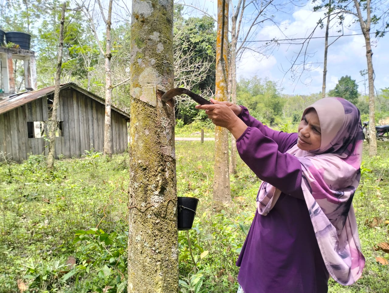 Seorang penoreh, Azizah Shafien, 57, berkata, musim panas menyebabkan daun pokok getah gugur dan susu getah kurang tetapi dia perlu menoreh kerana itu adalah pendapatan utama keluarganya.