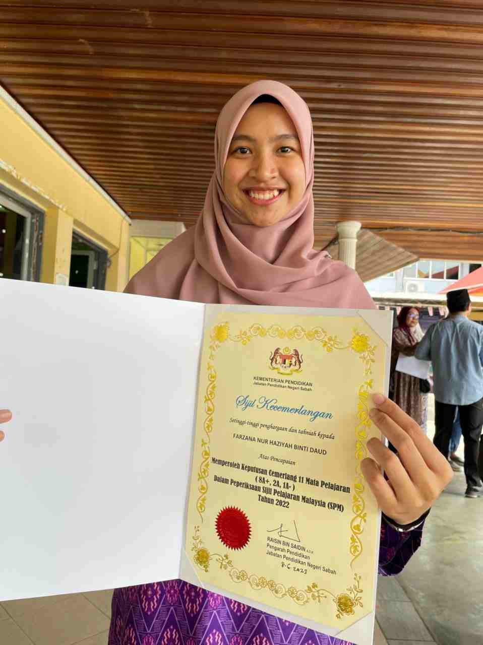 KOTA KINABALU: Melihat penat lelah ayah bekerja keras di kilang sawit bagi menampung perbelanjaan sekolah mereka empat beradik membuatkan Farzana Nur Haziyah Daud nekad untuk mengubah nasib keluarga dengan m,enjadi pelajar cemerlang Sijil Pelajaran Malaysia (SPM). Pelajar cemerlang Sijil Pelajaran Malaysia (SPM) 2022 dari Sekolah Menengah (SM) Islamiah Tawau itu berkata, kemiskinan hidup membuatkan dia bertekad untuk belajar bersungguh-sungguh untuk mengubah kehidupan mereka sekeluarga. “Faktor utama saya mahu belajar bersungguh-sungguh…