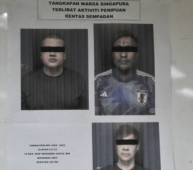 JOHOR BAHRU: Empat warganegara Singapura termasuk seorang wanita yang menjadikan sebuah kediaman rumah di Taman Perling di sini sebagai pusat operasi ‘scammer‘ mereka ditahan polis, bulan lalu.