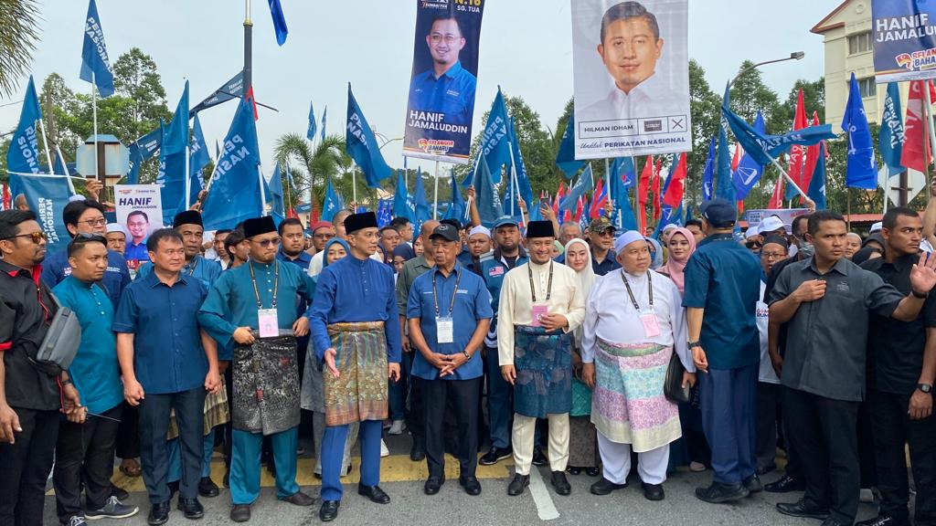 Mereka yang membawa bendera PN dan sepanduk calon bertakbir selain melaungkan ‘Cukuplah Sekali’ sebagai tanda sokongan kepada tiga calon PN iaitu Datuk Seri Mohamed Azmin Ali; Muhammad Hanif Jamaluddin dan Muhammad Hilman Idham.