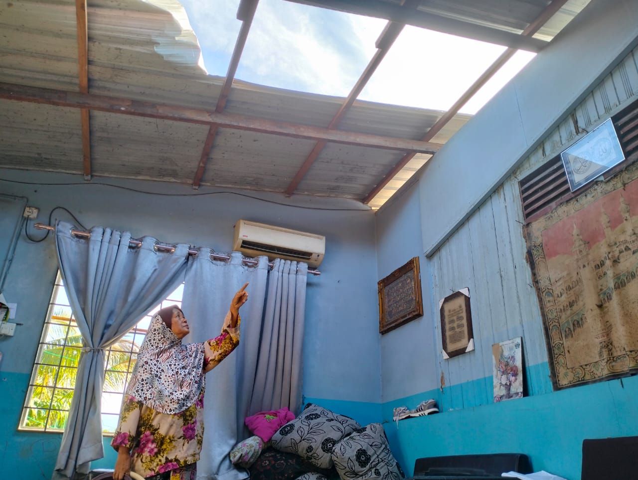 Zainun berkata, kejadian ribut itu juga menyebabkan stor di hadapan rumahnya runtuh dan sebatang pokok tumbang menimpa ruang dapur.