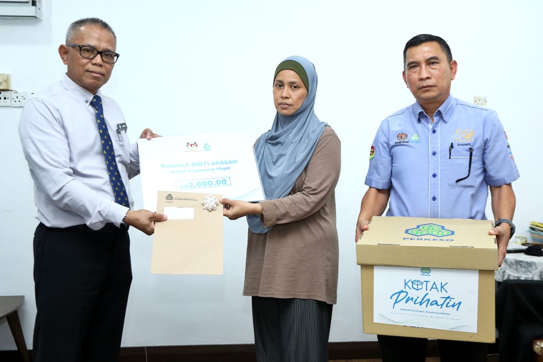 Terdahulu, dia menerima cek RM2,000 daripada Pertubuhan Keselamatan Sosial (Perkeso) bagi bayaran faedah pengurusan mayat yang disampaikan oleh Timbalan Pengarah Perkeso Perak, Roslan Pilus.