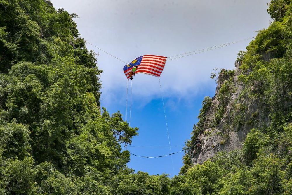 Malah, turut kelihatan ahli persatuan berkenaan dalam keadaan terapung di sebalik awan biru di antara laluan dua bukit untuk pemasangan Jalur Gemilang itu.