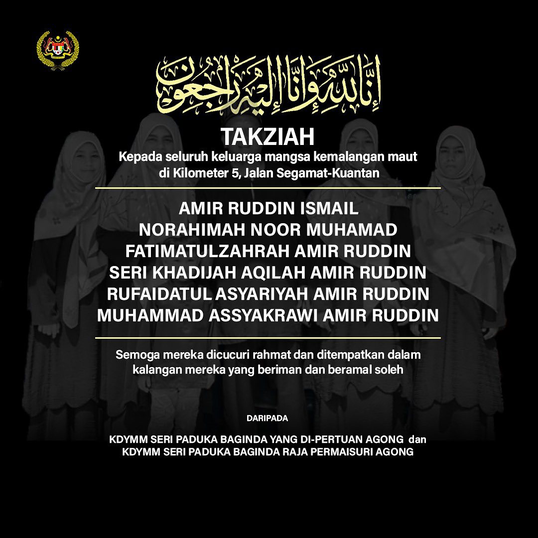 “Seri Paduka Baginda berdua turut menzahirkan rasa sedih dengan pemergian mereka sekeluarga dan menzahirkan harapan agar seluruh keluarga mereka sabar serta tabah menghadapi dugaan dan suasana pilu ini.