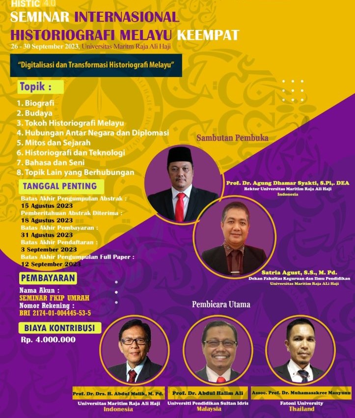 Justeru, Persatuan Penulis Budiman Malaysia (BUDIMAN) dengan kerjasama Fakulti Bahasa dan Komunikasi (FBK), Universiti Pendidikan Sultan Idris (UPSI) dan Fakulti Ilmu Keguruan dan Pendidikan, Universiti Maritim Raja Ali Haji (UMRAH), Tanjongpinang, Kepulauan Riau Indonesia akan mengadakan Persidangan Antarabangsa Historiografi Melayu (HISTIC) 4.0 pada 26 dan 30 September ini.
