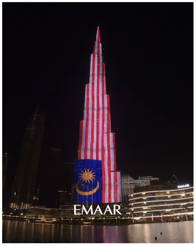 “Tonight, #BurjKhalifa shines for Malaysia’s Independence Day. As you mark this momentous day, may your nation flourish and your citizens embrace unity, prosperity, and joy. Warm wishes for a Happy Independence Day (#BurjKhalifa bersinar untuk Hari Kebangsaan Malaysia. Semoga negara anda berkembang maju dan rakyat mengekalkan perpaduan, kemakmuran dan kebahagiaan. Selamat Hari Kebangsaan)”.