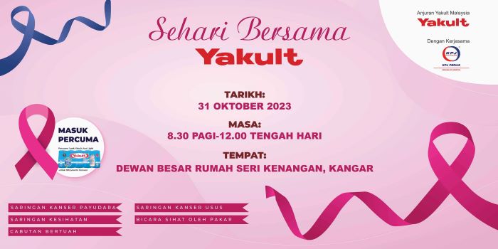 KANGAR: Yakult Malaysia akan menganjurkan Kempen Kesedaran Kanser – Sehari Bersama Yakult di Rumah Seri Kenangan di sini pada Selasa ini bermula pukul 8.30 pagi sehingga 12 tengah hari.