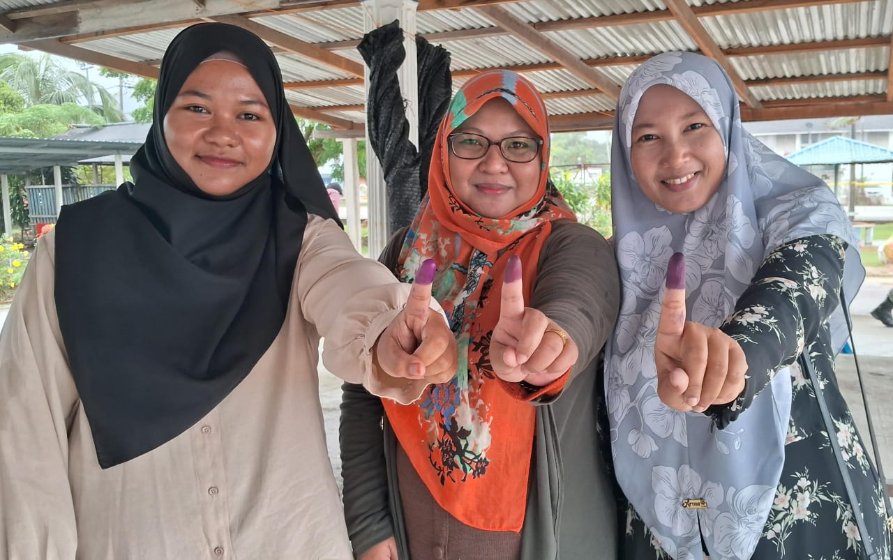 KEMAMAN: Tiga individu pengundi awal yang merupakan isteri kepada anggota tentera selesai membuang undi bagi Pilihan Raya Kecil (PRK) Parlimen Kemaman di Balai Polis Kijal, di sini, pagi ini.