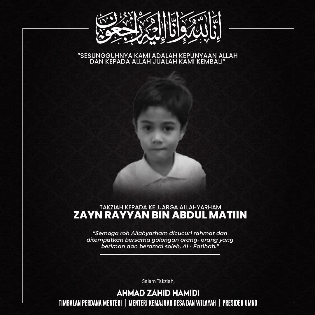 “Semalam, usai pulang daripada mesyuarat Majlis Kerja Tertinggi UMNO, saya membaca perkhabaran duka tentang kanak-kanak autistik berusia enam tahun, anak syurga Zayn Rayyan yang dilaporkan hilang sejak selasa ditemukan dalam keadaan meninggal dunia di sebuah sungai, berhampiran lokasi hilang di Apartment Idaman, Damansara Damai.