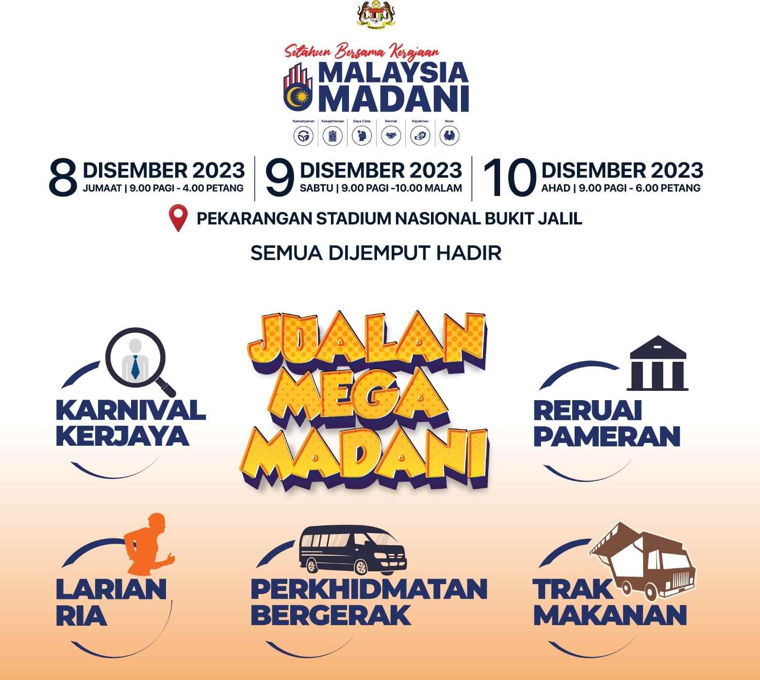 PETALING JAYA: Orang ramai disaran hadir ke Program Setahun Bersama Kerajaan Madani yang bermula esok hingga Ahad ini di pekarangan Stadium Nasional Bukit Jalil menggunakan pengangkutan awam.