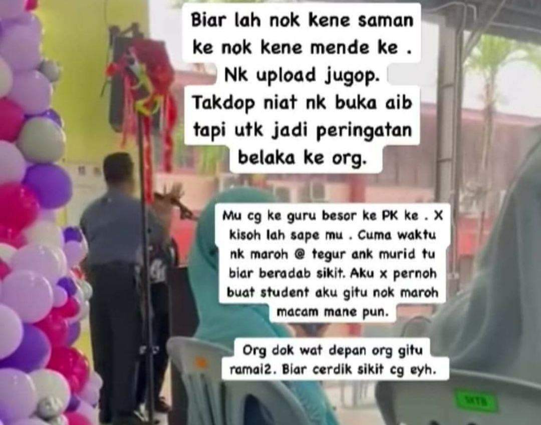 Video tersebut dikongsikan menerusi hantaran di laman sosial milik seorang wanita, dipercayai guru sekolah yang sama dengan teks tulisan ‘pendidik harus terdidik’.