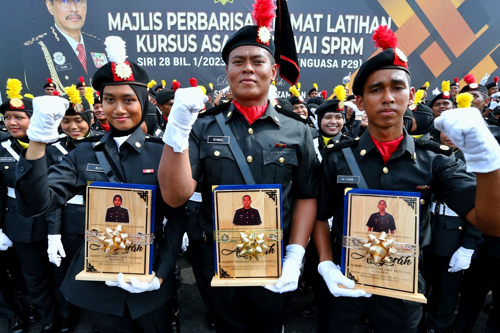 Lebih manis, Mohammad Ikhmal Mohamad Huzir Affindi, 29, menerima anugerah Kadet Terbaik Keseluruhan Bagi Kursus Asas Pegawai SPRM Siri 28 Bil. 1/2023 (Penolong Penguasa Gred P29).