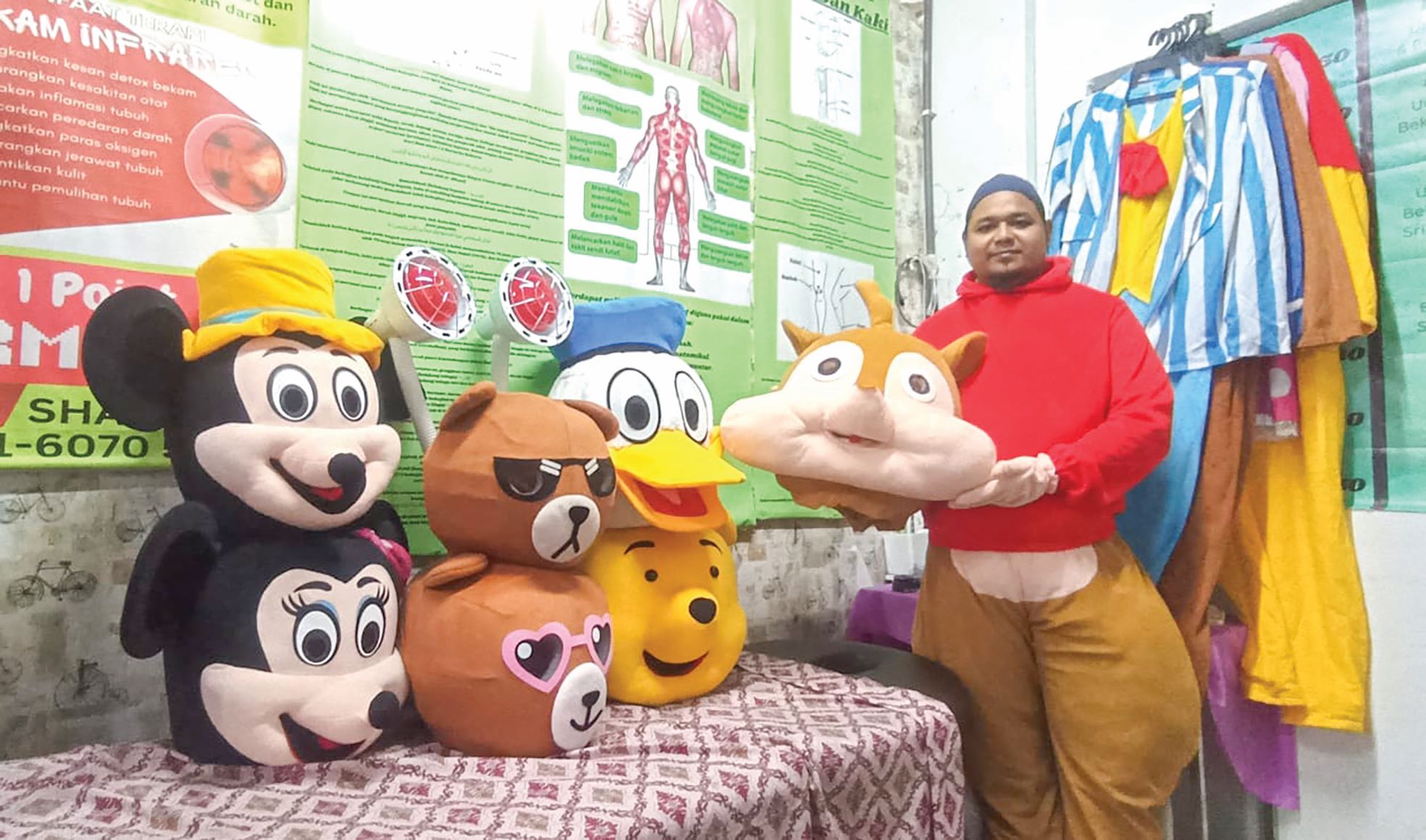 BATU GAJAH: Mohd Shahrul Nizam Abd Razak, 30, tidak kisah berpanas, berpeluh apa lagi berdiri lama dengan memakai kostum pelbagai maskot bagi ‘menggembirakan’ pelanggan terutama kanak-kanak.