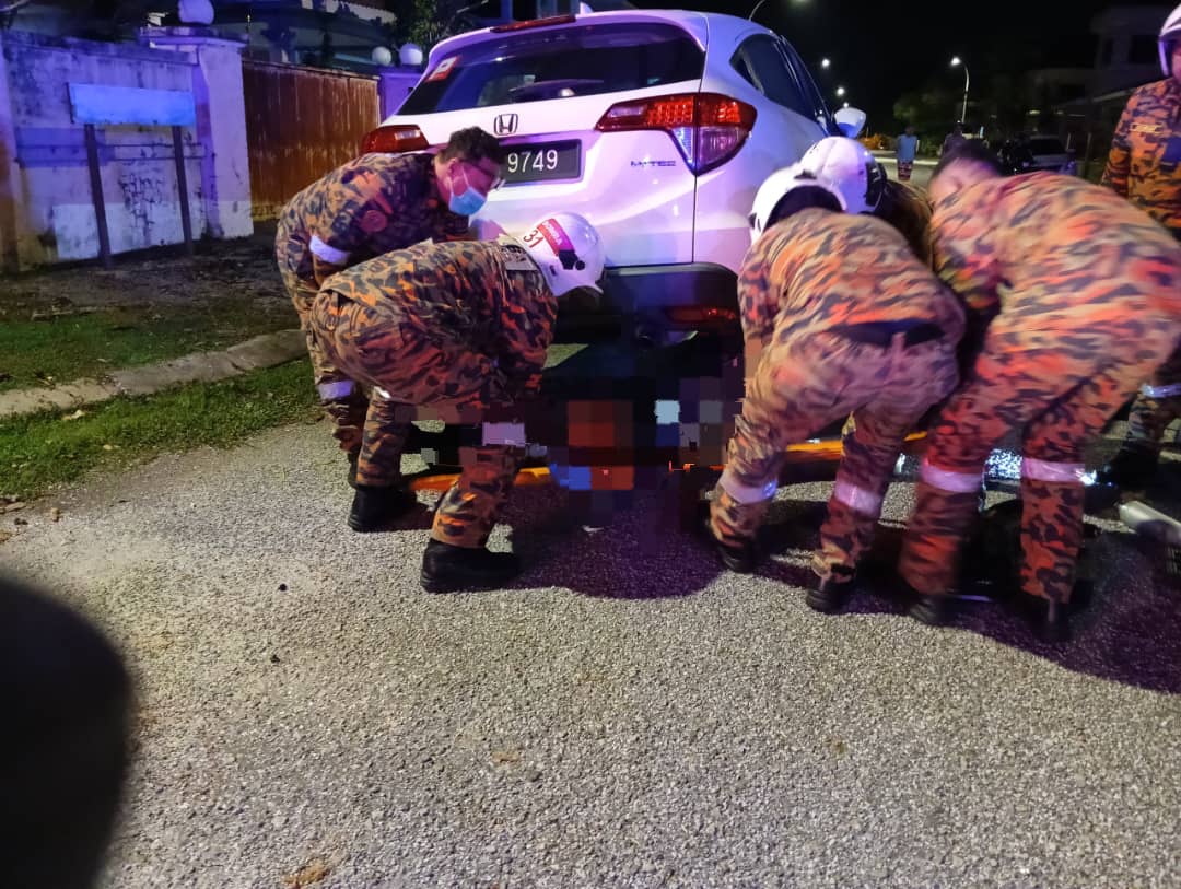 “Kemalangan melibatkan sebuah motosikal ditunggang seorang remaja lelaki dengan sebuah kenderaan pelbagai guna (MPV) di mana mangsa telah terperosok di bawah kereta.